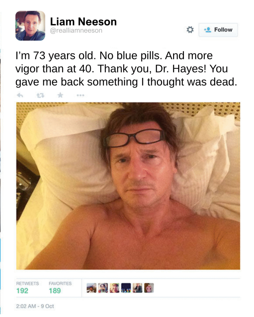 According to sources close to the actor, the treatment not only restored his sexual performance, but also boosted energy levels and physical stamina, something Neeson described as “feeling young again in my own body.”